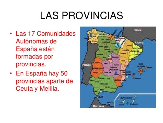 Las comunidades autonomas from image.slidesharecdn.com Como ya ha sido mencionado antes, españa está dividida en 50 provincias, además de 2 ciudades autónomas. ¿cuántas provincias tiene españa en su totalidad? Informacion de todas las provincias de españa. Haz click siobre la que quieras y accede al callejero de cada una de sus ciudades. 2020 septiembre inicio y además provincias de españa. «españa está formada de 17 comunidades autónomas o regiones. Se encuentra situada a una altitud de 754 met. Aprende cuales son las provincias de españa con este video.